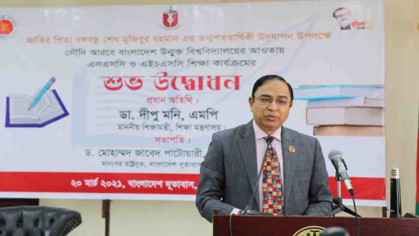 জাতির পিতা বঙ্গবন্ধু শেখ মুজিবুর রহমানের জন্মশতবার্ষিকী উদযাপন উপলক্ষে সৌদি আরবে বাংলাদেশ উন্মুক্ত বিশ্ববিদ্যালয়ের আওতায় এসএসসি ও এইচএসসি শিক্ষা কার্যক্রম শুরু করা হয়েছে। দূতাবাসের সংবাদ বিজ্ঞপ্তিতে এই তথ্য জানানো হয়েছে।